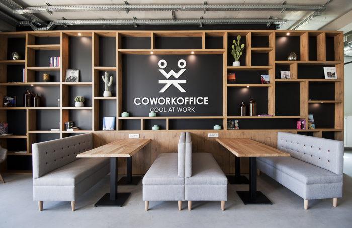 Table haute, écran de projection, murs noirs comme l’onyx. Cette salle de réunion intimiste est située au rez-de-chaussée de Coloft.