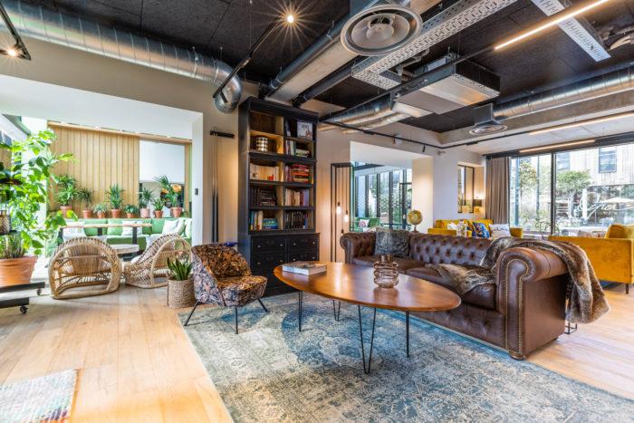 Fauteuils cosy et table basse pour se plonger le temps d’une réunion informelle dans l’ambiance Miami Art.